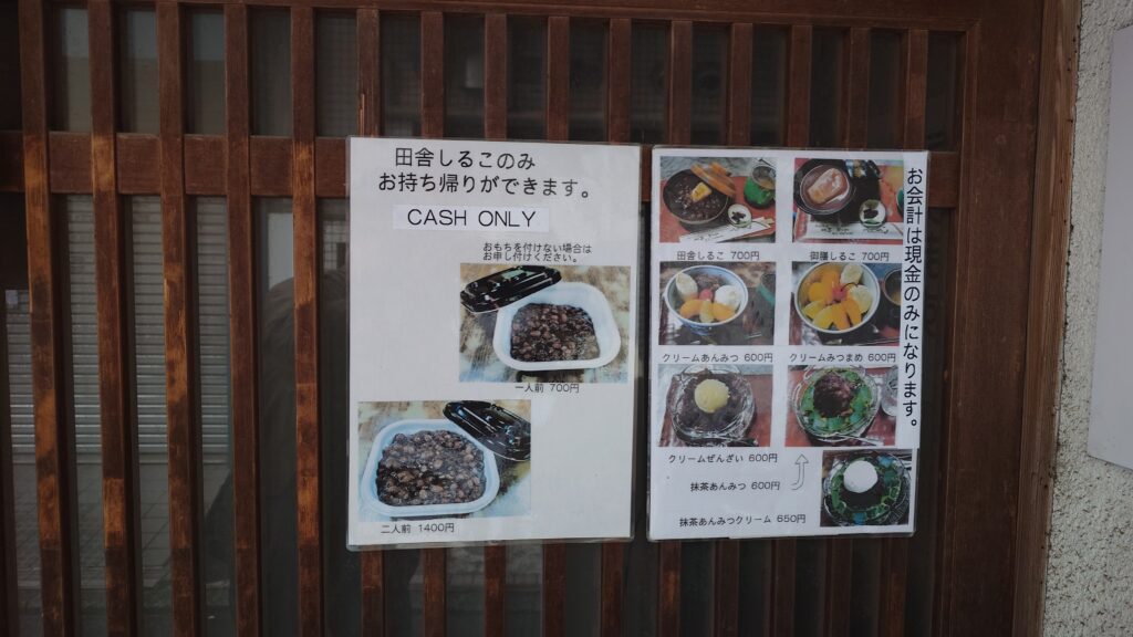 こし餡の「御前しるこ」もありますが、絶対に粒あんの「田舎しるこ」がおすすめです。
