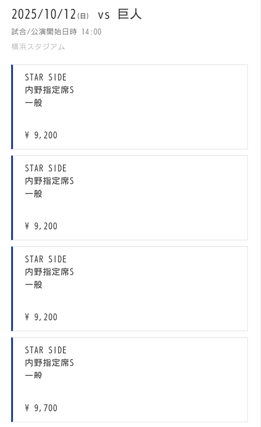 1. 名義1:10/12(日)3塁側STAR BOXシート4 47,600円⇒ハズレ