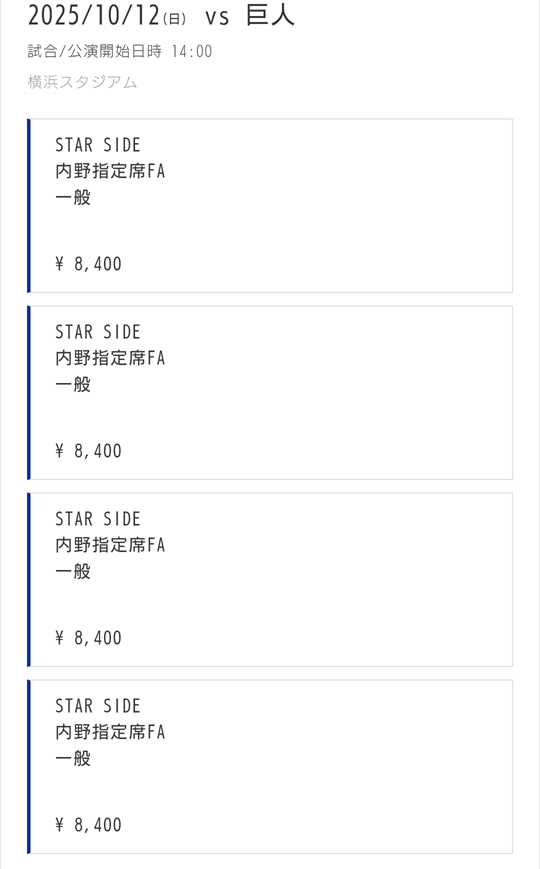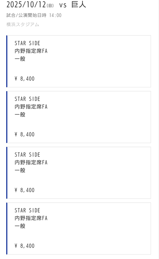 4. 追加名義3:10/12(日)3塁側内野指定席FA 8,400円×4枚⇒当選!