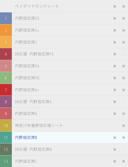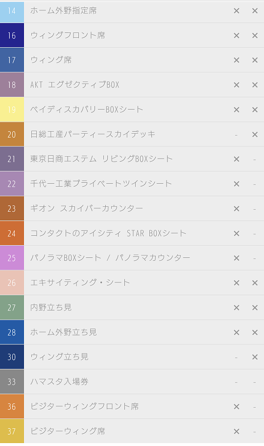 ビジター応援エリア、ハマスタ入場券を除く全ての席種