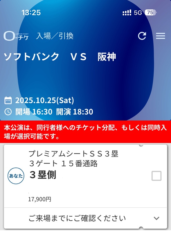 阪神FC抽選、エルアン先行ともに全敗でしたが、本日粘って13:30過ぎにローチケで第4戦ブリーズシートが1枚取れました(通路側でした)。