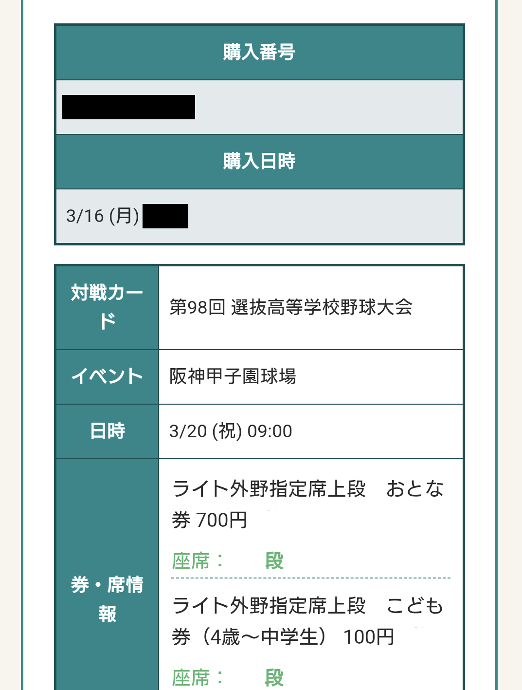 ちなみに、甲チケは購入時に座席指定ができないのですが、購入前に座席位置がわかるので、「イマイチだったらキャンセル→取り直し」で、普通に通路横からの連番を確保できます。