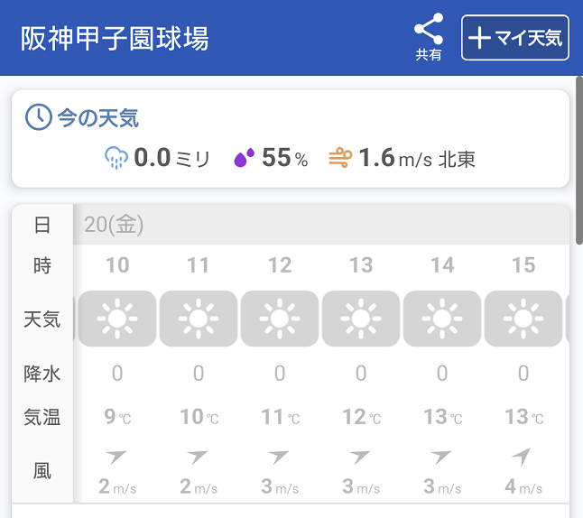 私が観戦した時間帯の気温は、「10度~13度、風はほほ無し、晴れ」と、かなりいい環境でした。」