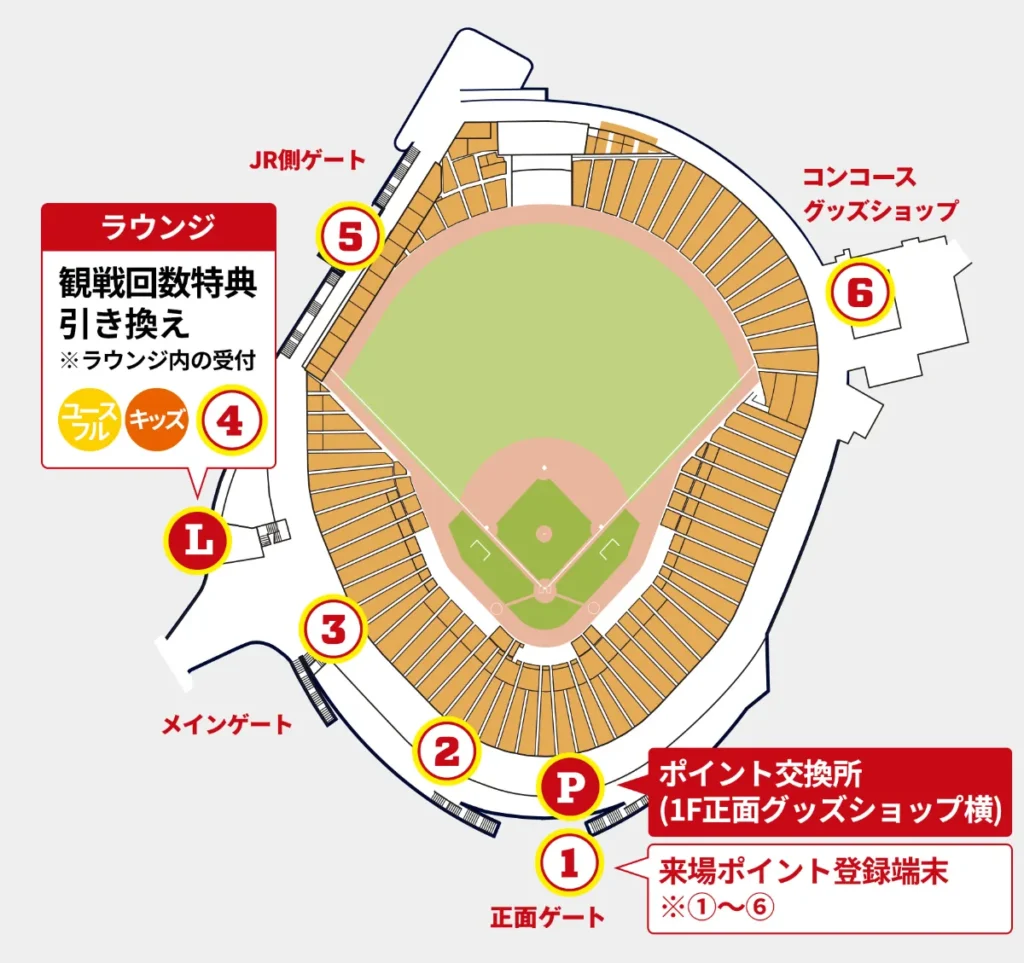 来場ポイントは、球場内の6か所にある登録端末で獲得できます。