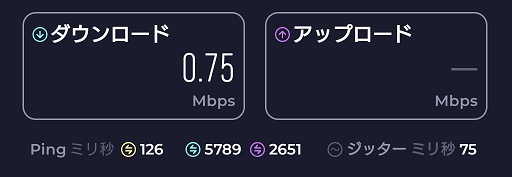 下り0.75Mbps、上り測定不能というひどい結果です。