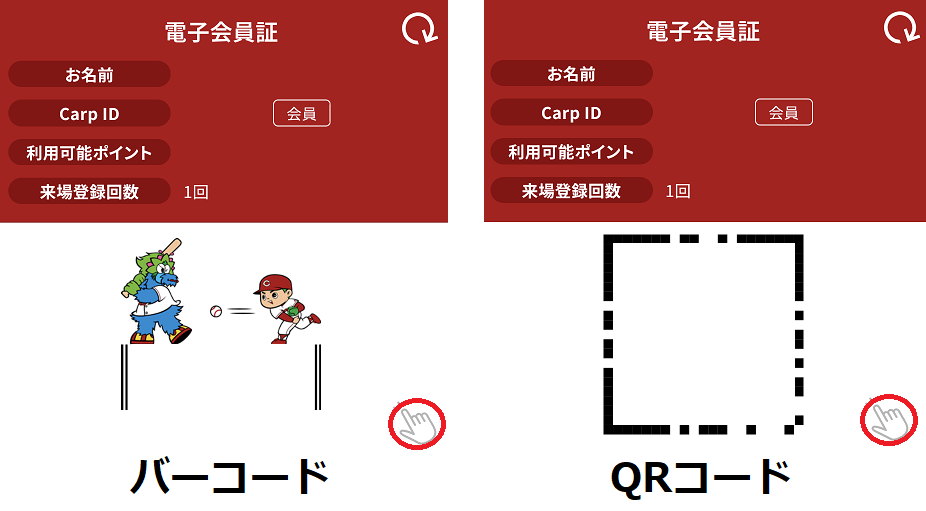 よくわからないのですが、カープIDの表示画面に「バーコードとQRコード」の2種類があるんですよね。