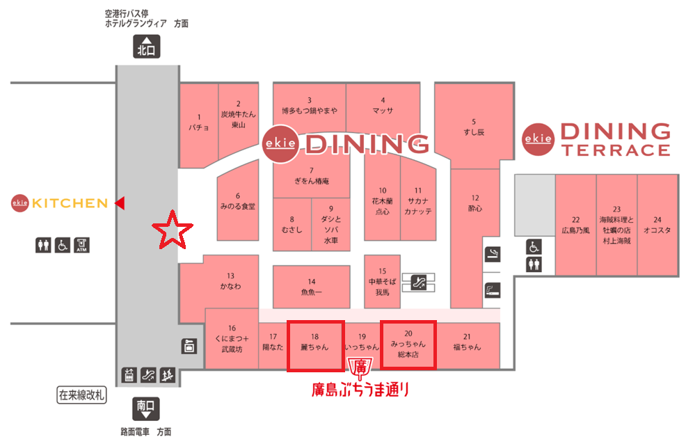 JR広島駅「ekie」で人気のお好み焼き屋さんといえば、「みっちゃん」、「麗ちゃん」が有名です。