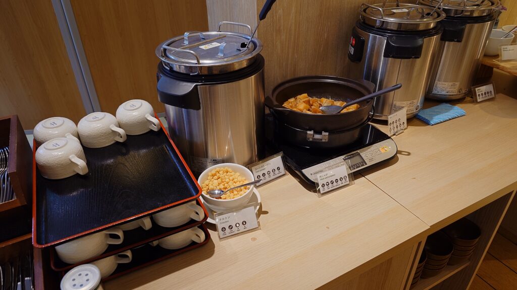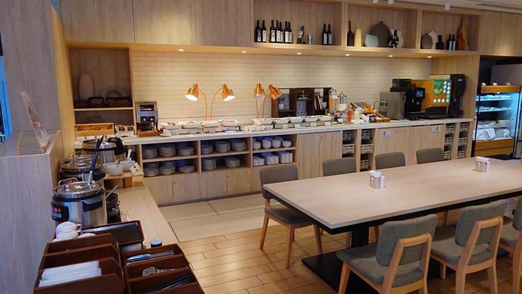 朝食の会場はフロント前のスペースですが、朝食をとる人以外は立ち入りがないので、普通に食事をとることができます。