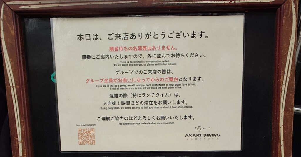 お店の前には、順番待ちについてのお知らせがあります。