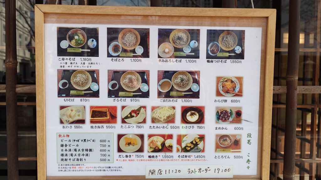 「こ寿々」は、若宮大路沿いにあるお蕎麦屋さんで、昭和初期の木造建物が目印です。