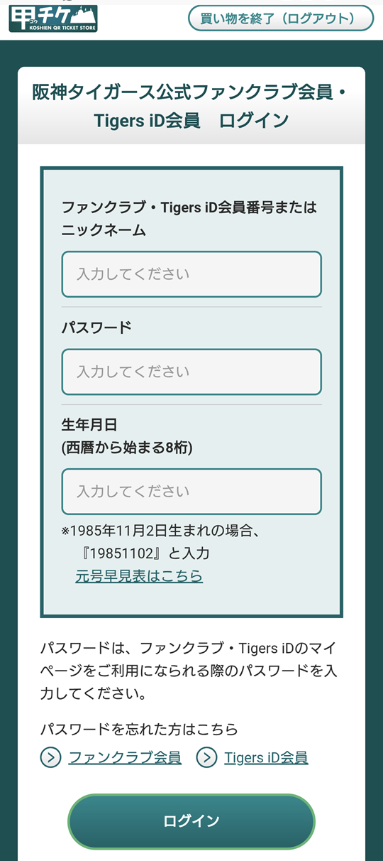 事前にタイガースファンクラブ、TigersIDでログオンするための必要な情報(ID、パスワード、生年月日)を確認しておきましょう。