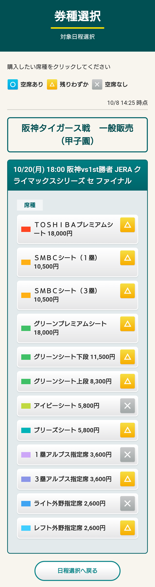 甲子園球場のタイガース戦の場合、年間指定席が売り切れているエリアは、そもそも販売されるチケット数が少なく、あったとしても後方のイマイチのお席が多いです。