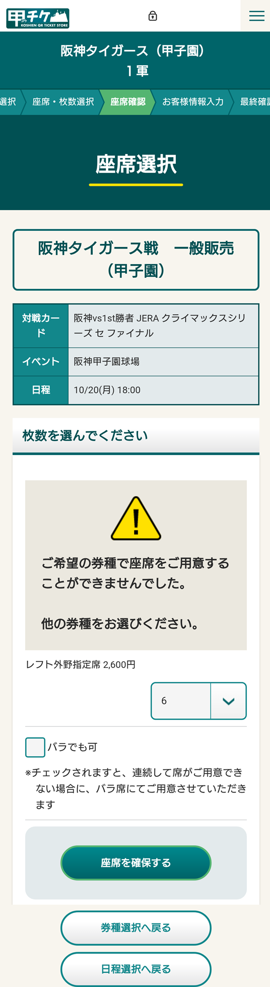 発売直後の甲チケでは、1試合分のチケットを購入した後、1度ログアウトしないと次のチケットを購入できません。