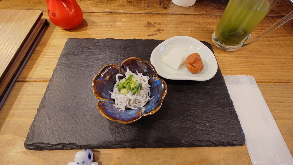 鮭が焼けるまで、小鉢が提供されます。