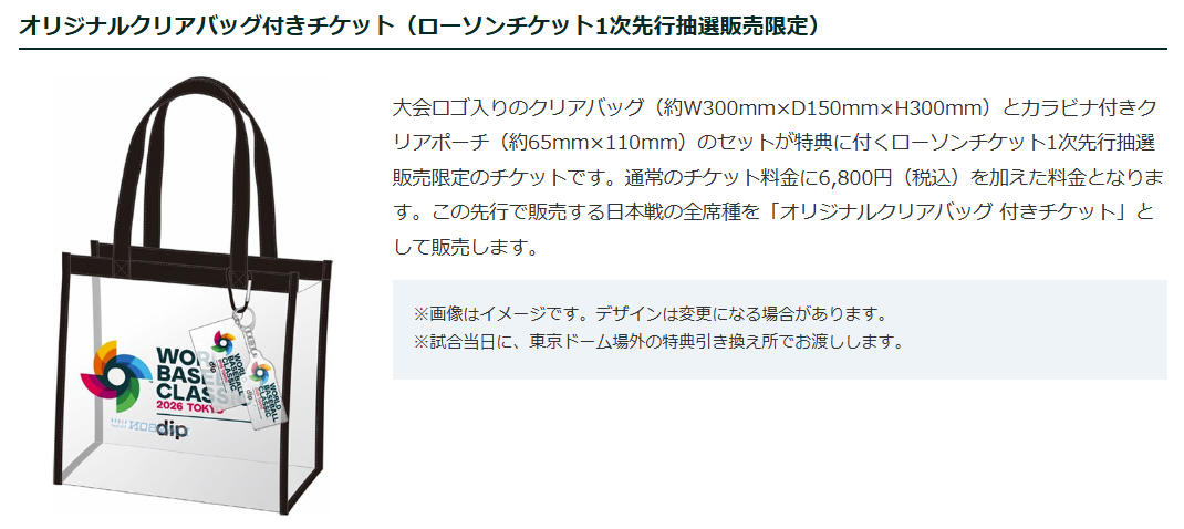 大会ロゴ入りのクリアバッグとカラビナ付きクリアポーチのセットが特典に付くローソンチケット1次先行抽選販売限定のチケットです。通常のチケット料金に6,800円(税込)を加えた料金となります。この先行で販売する日本戦の全席種を「オリジナルクリアバッグ 付きチケット」として販売します。
